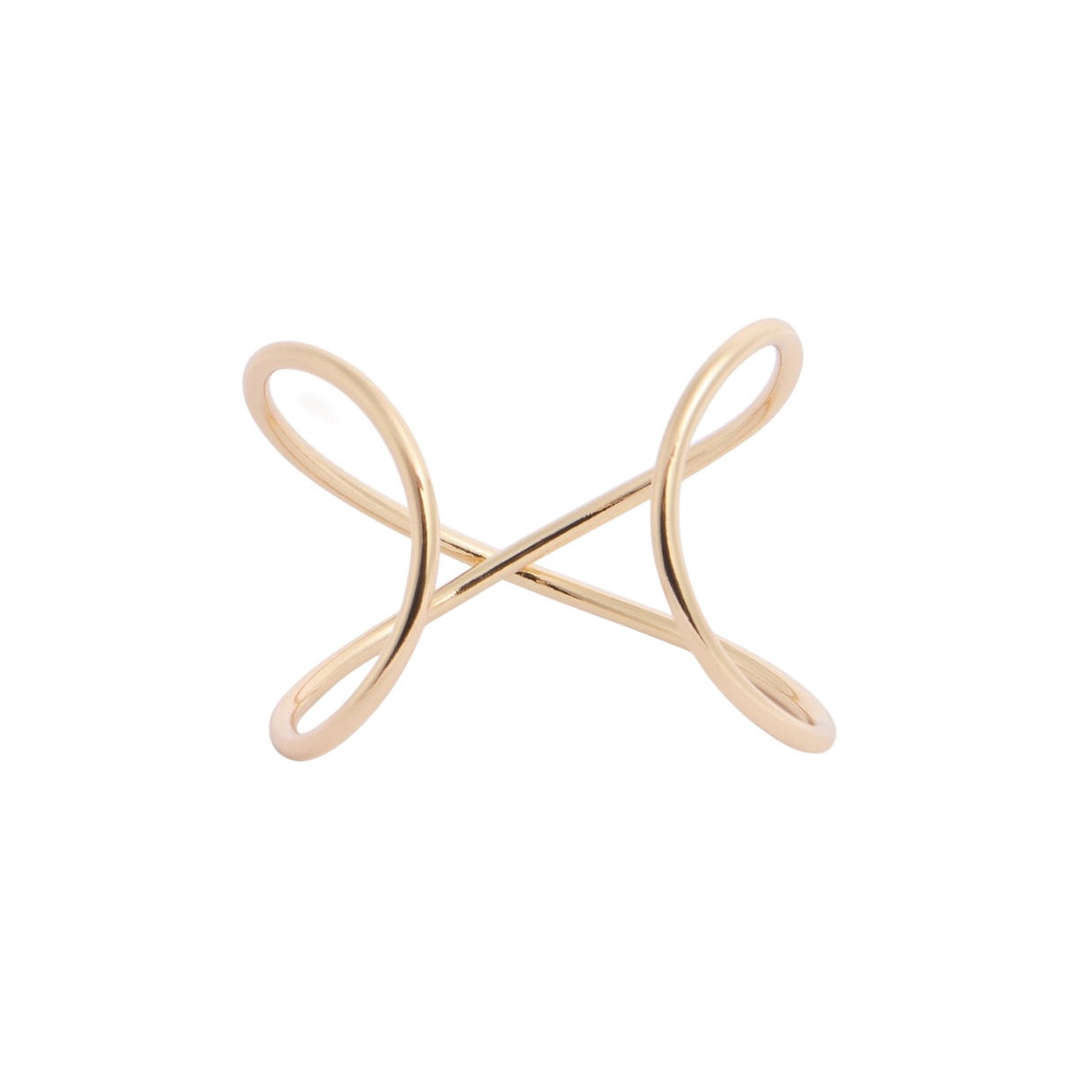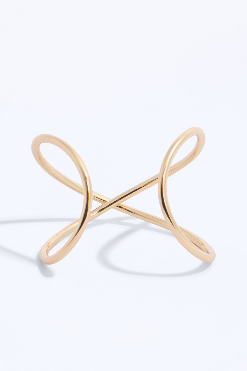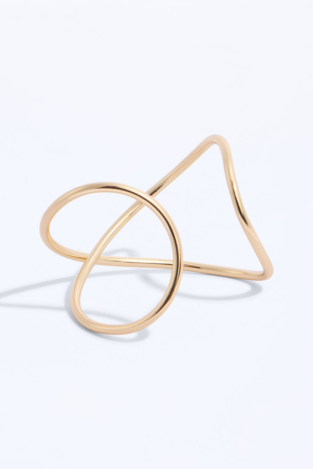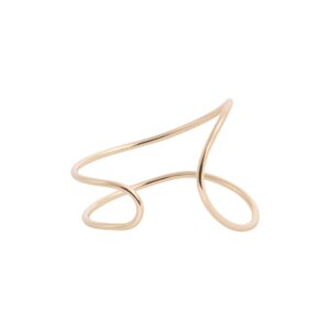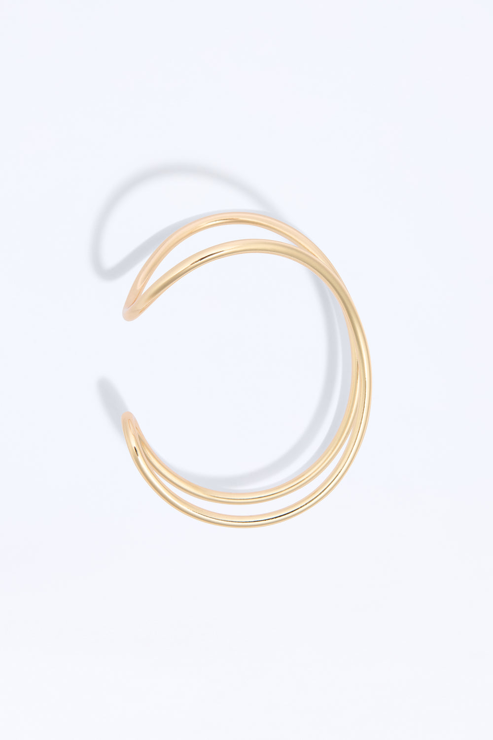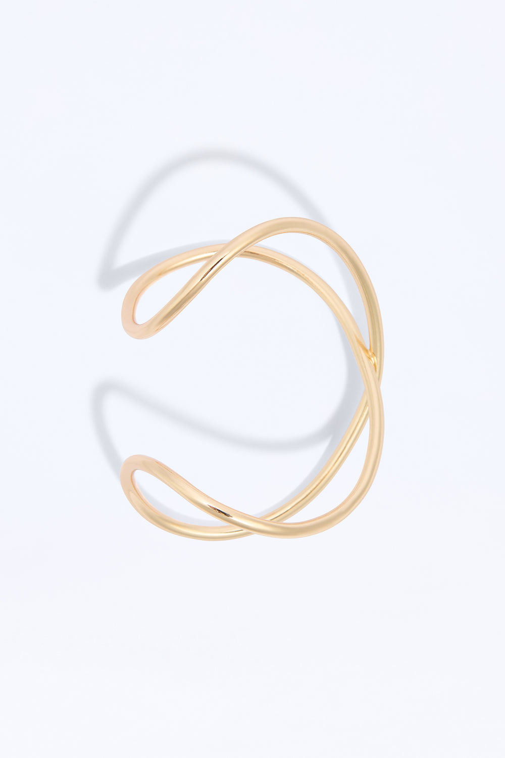 Bracciale in metallo oro tubolare dalle linee sinuose che abbracciano il polso.