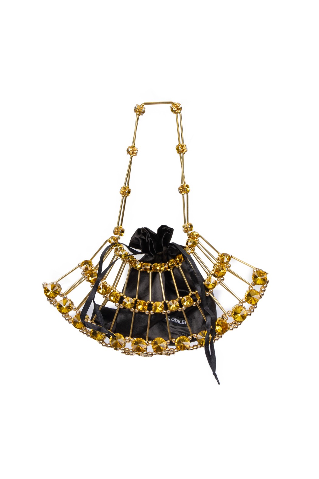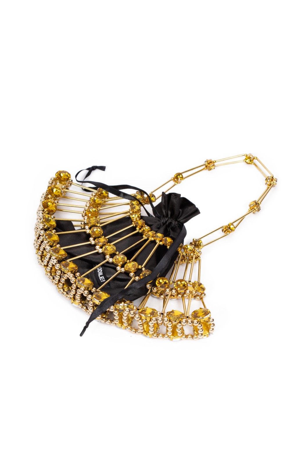 Borsa gioiello da donna dal design sofisticato e scenografico, pensata per valorizzare il look con un accessorio luminoso, elegante e di forte impatto. Il modello si distingue per la sua originale struttura semicircolare in metallo dorato, impreziosita da cristalli decorativi che riflettono la luce e donano un effetto prezioso e glamour. All’interno, il pratico sacchetto in tessuto nero crea un raffinato contrasto cromatico e custodisce gli effetti personali con stile. La silhouette compatta ma ricercata rende questa borsa a mano elegante perfetta per completare outfit da cerimonia, look da sera, party ed eventi speciali. Un accessorio statement che unisce ispirazione bijoux, femminilità e design contemporaneo, ideale per chi desidera distinguersi con dettagli esclusivi.