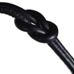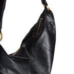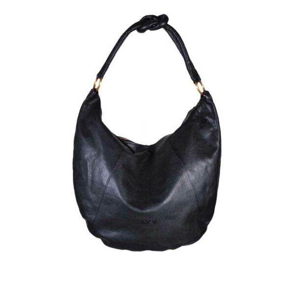 Shopper a mezzaluna in pelle bottolata nera con logo impresso frontale, nodo morbido sul manico e chiusura con zip.