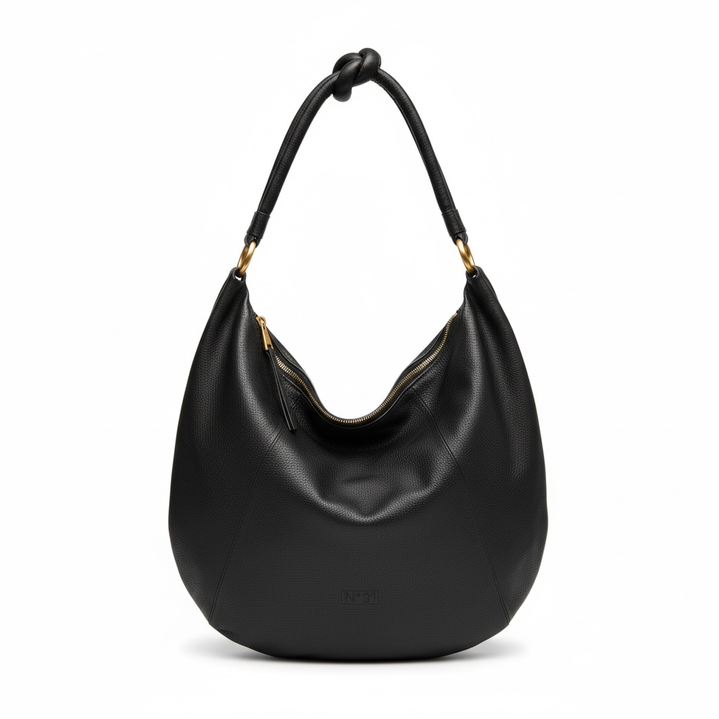 Shopper dimensione medio grande a mezzaluna in pelle bottolata nera con logo impresso frontale, nodo morbido sul manico e chiusura con zip.