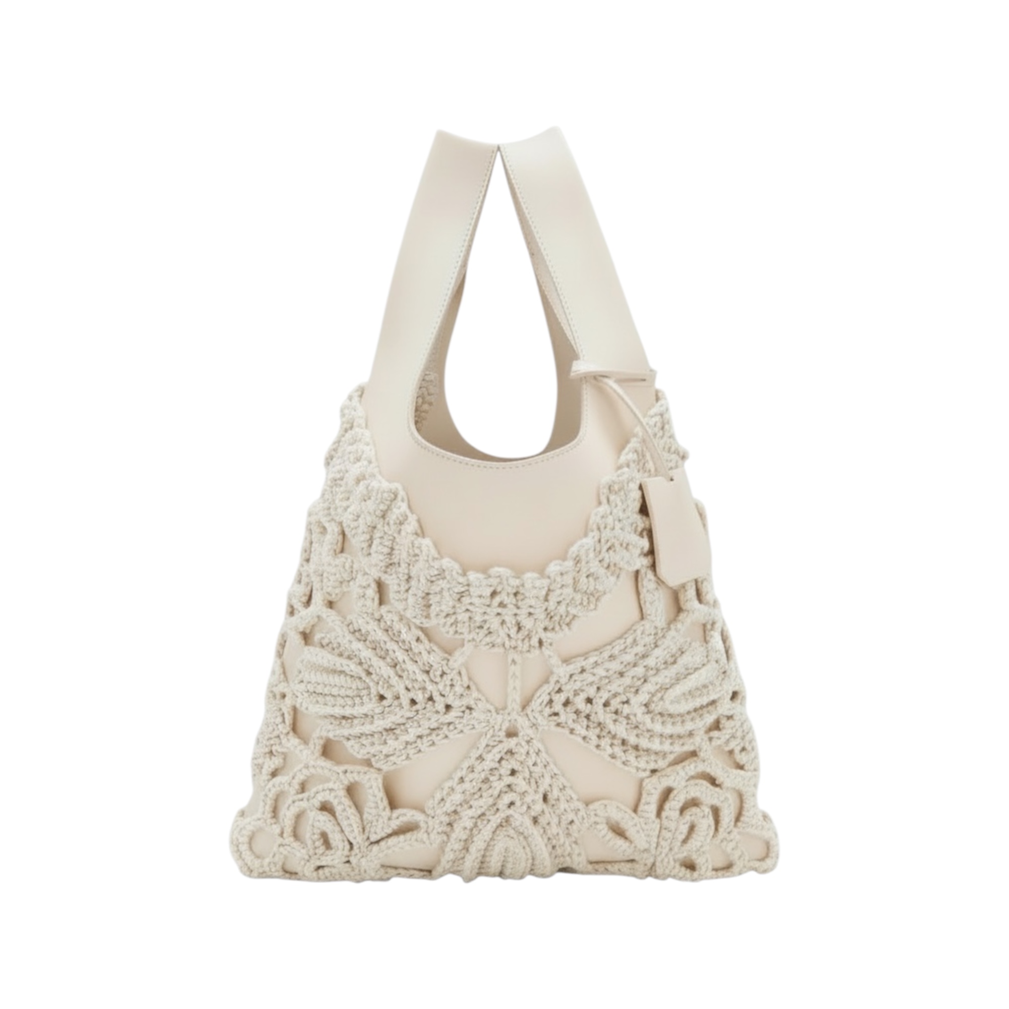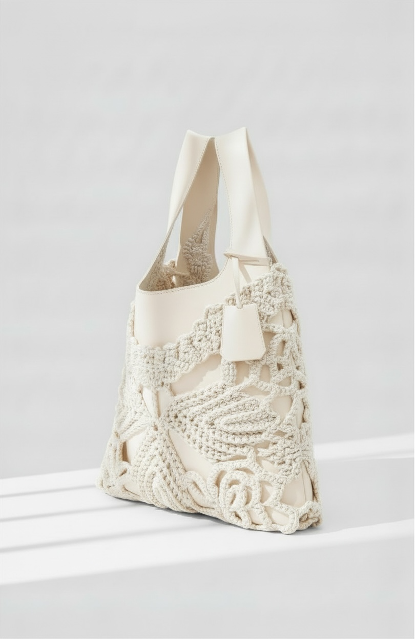 Tbag bianca in nappa con guscio in filato sfera panna a uncinetto