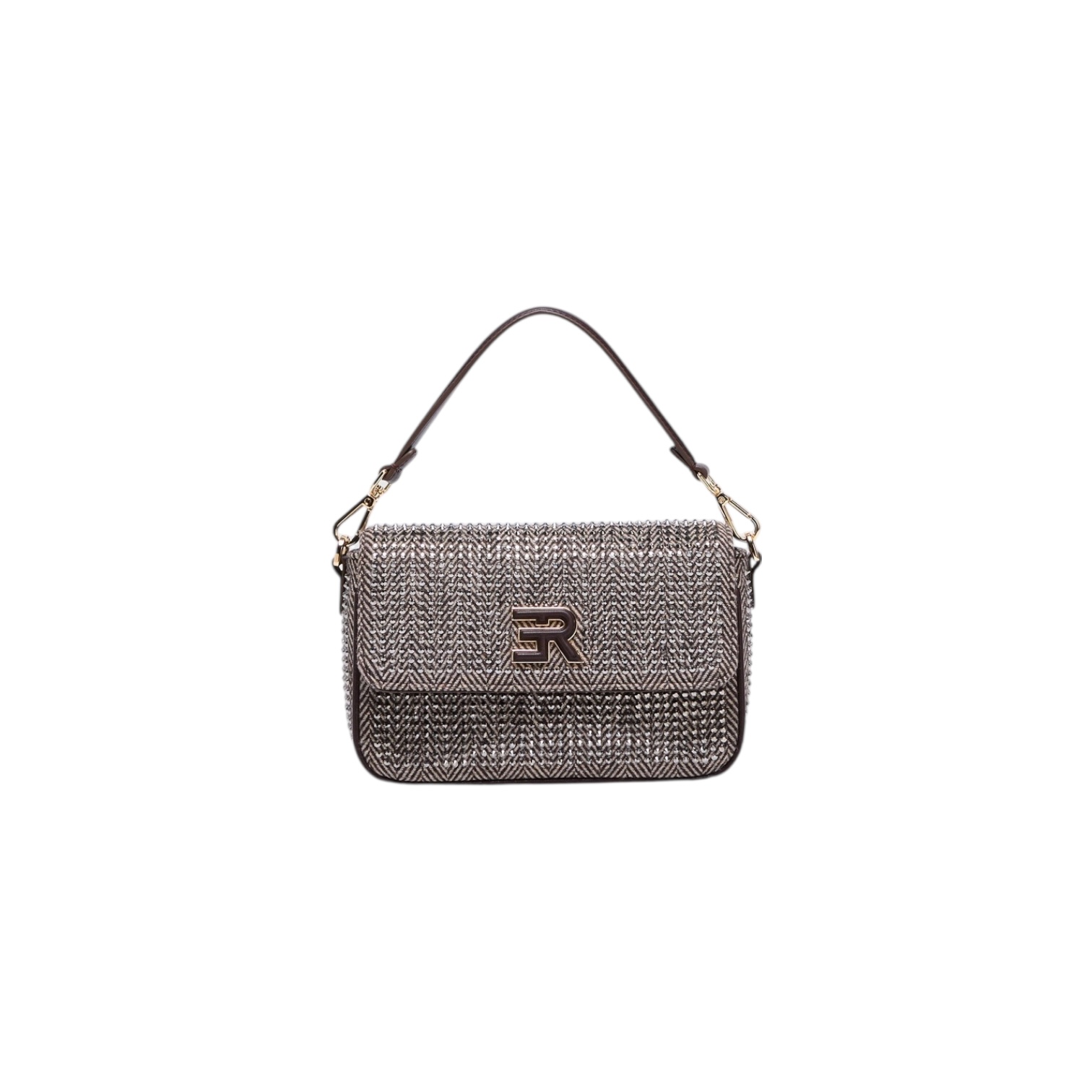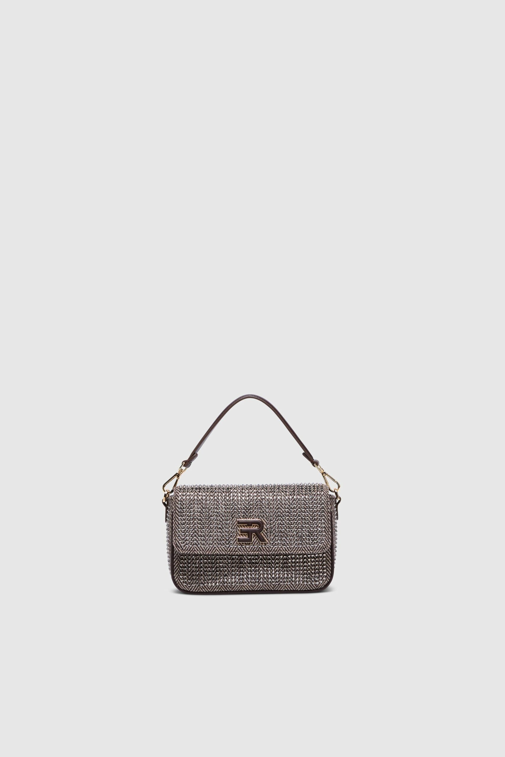 Borsa in tessuto spinato color testa di moro, cristalli all over in color fumè, manico e tracolla a catena con profili in ecopelle marroni.
